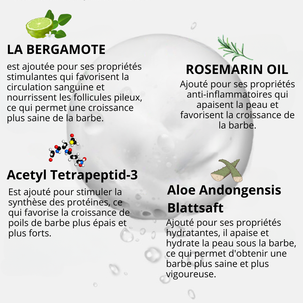 Notre Beard Growth Oil stimule la croissance des poils grâce à une combinaison d'ingrédients naturels qui favorisent la circulation sanguine vers les follicules pileux, stimulant ainsi la croissance des poils.