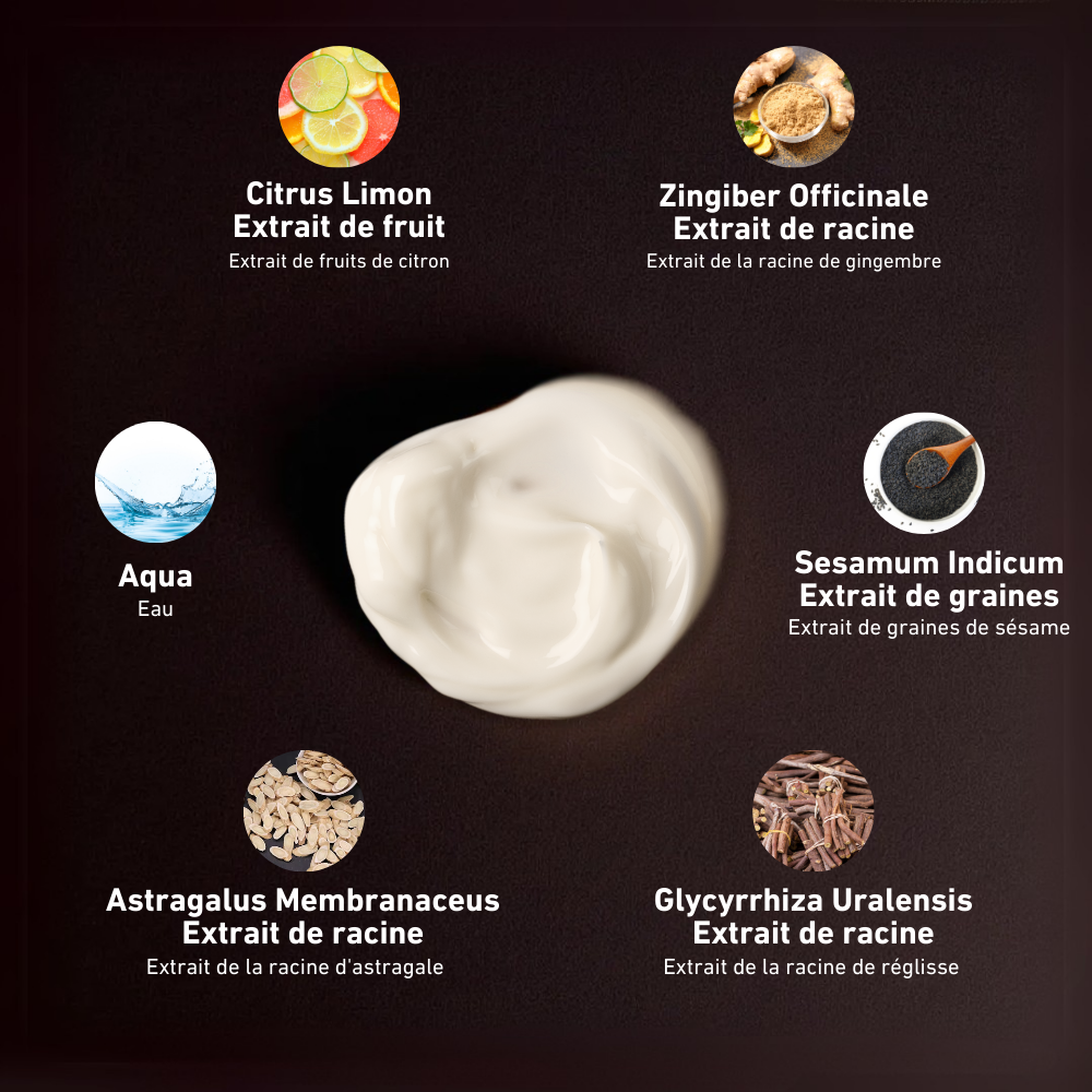 Les racines des cheveux reçoivent à nouveau de l'oxygène et sont réactivées, tandis que l'extrait de ginseng stimule davantage la croissance des cheveux.